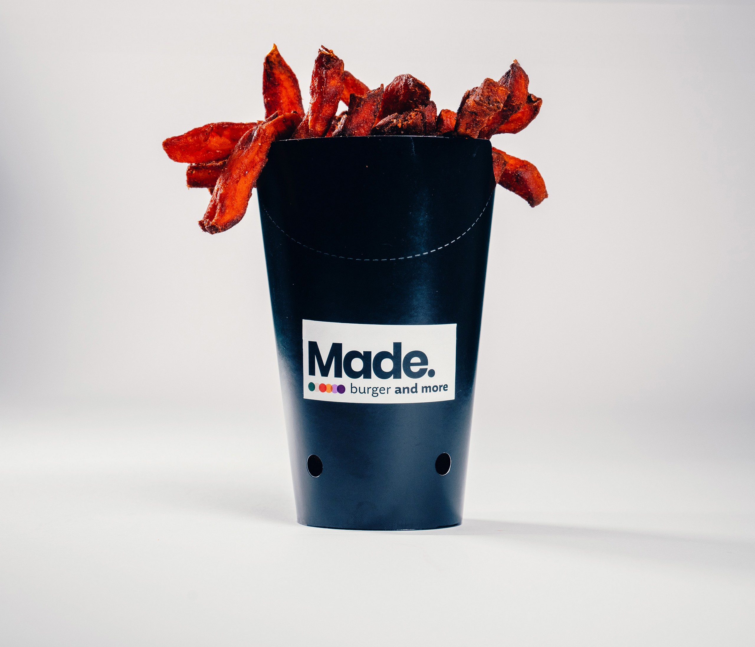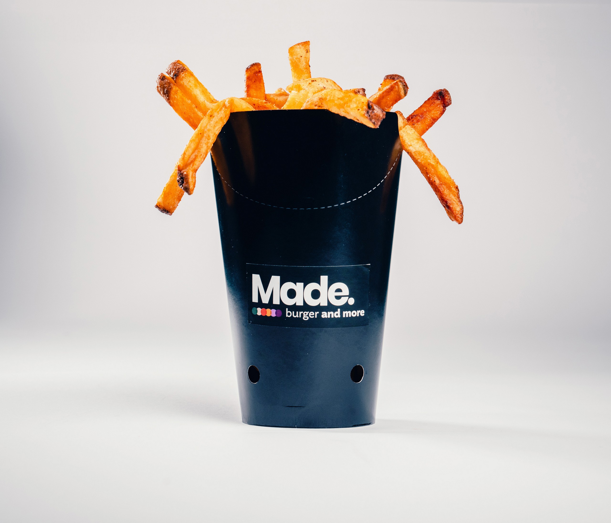 Goûtez nos frites maison en double cuisson qui les rend à la fois croustillantes à l'extérieur et moelleuses à l'intérieur (comme on les aime). Préparées avec des pommes de terre Agria, elles sont coupées chaque matin pour garantir fraîcheur et perfection. Made. ajoute sa petite touche avec son sel rouge.