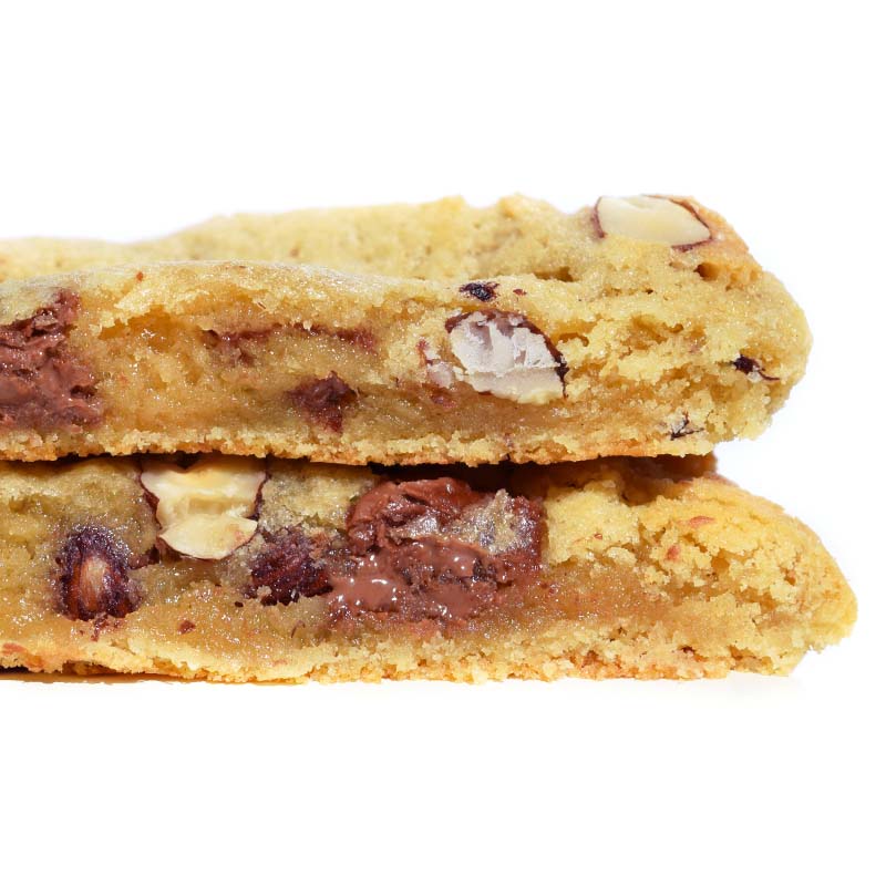 Succombez à notre cookie artisanal croustillant à l'extérieur et moelleux à l'intérieur au chocolat au lait et noisettes torréfiées. Une véritable explosion de saveurs et de croquant.